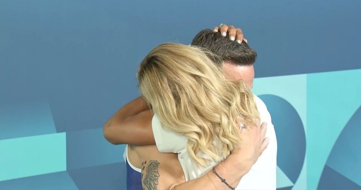 Ο Λευτέρης Πετρούνιας αγκαλιά με τη Βασιλική Μιλλούση στη μεικτή ζώνη μετά την κατάκτηση του χάλκινου μεταλλίου.