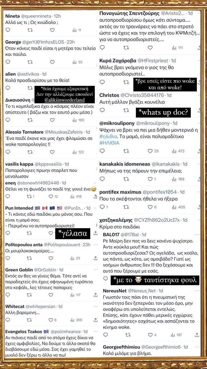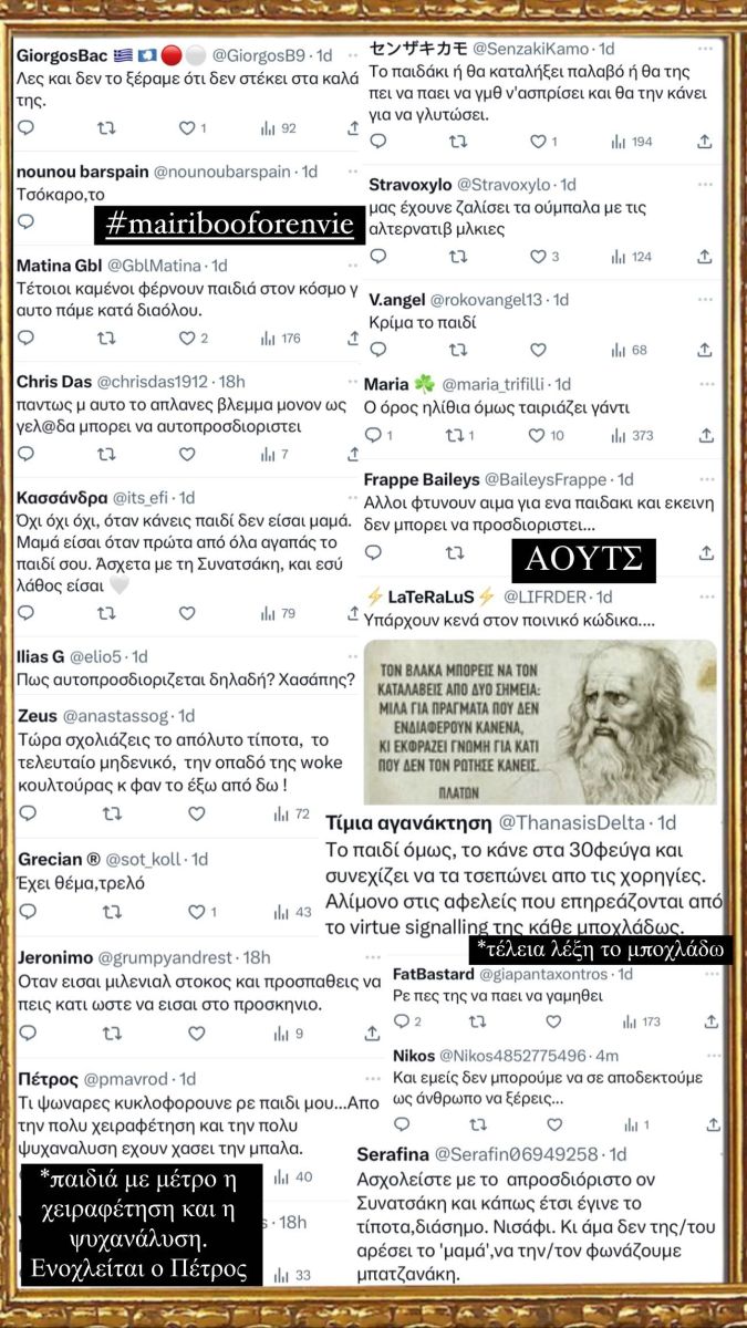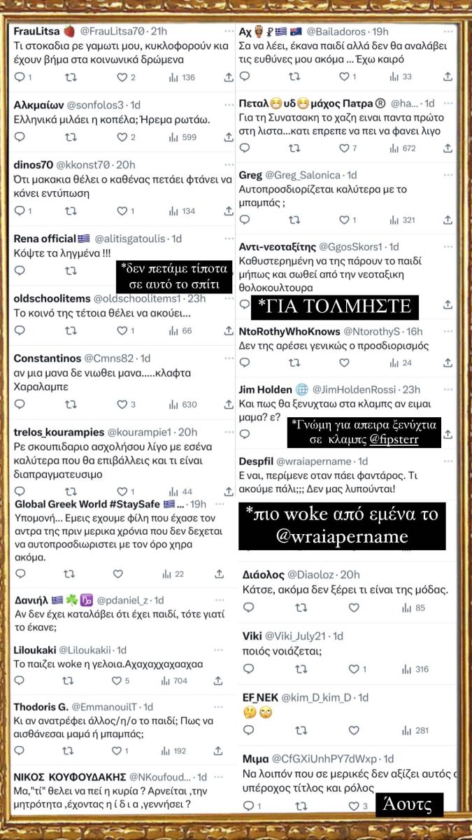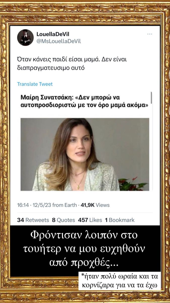 «Φρόντισαν, λοιπόν, στοTwitter να μου ευχηθούν από προχθές. Ήταν πολύ ωραία και τα κορνίζαρα για να τα έχω», έγραψε η Μαίρη Συνατσάκη, ανεβάζοντας ένα από τα πικρόχολα σχόλια που δέχτηκε.