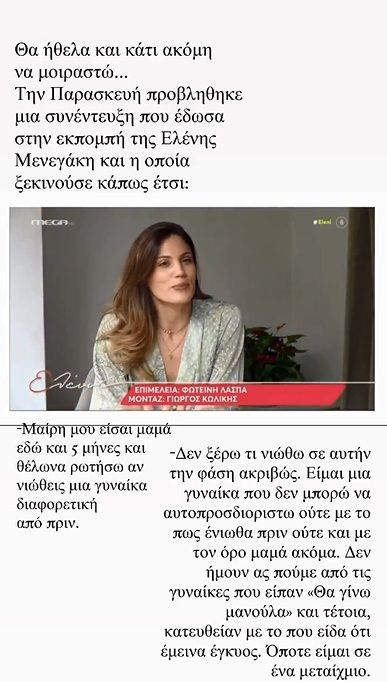 «Θα ήθελα και κάτι να μοιραστώ. Την Παρασκευή προβλήθηκε μια συνέντευξη που έδωσα στην εκπομπή της Ελένης Μενεγάκη, η οποία ξεκινούσα κάπως έτσι: “Μαίρη μου, είσαι μαμά εδώ και πέντε μήνες και θέλω να σε ρωτήσω, αν νιώθεις μια γυναίκα διαφορετικό από πριν…”», έγραψε αρχικά η Μαίρη Συνατσάκη και συνέχισε με την απάντηση που έδωσε: