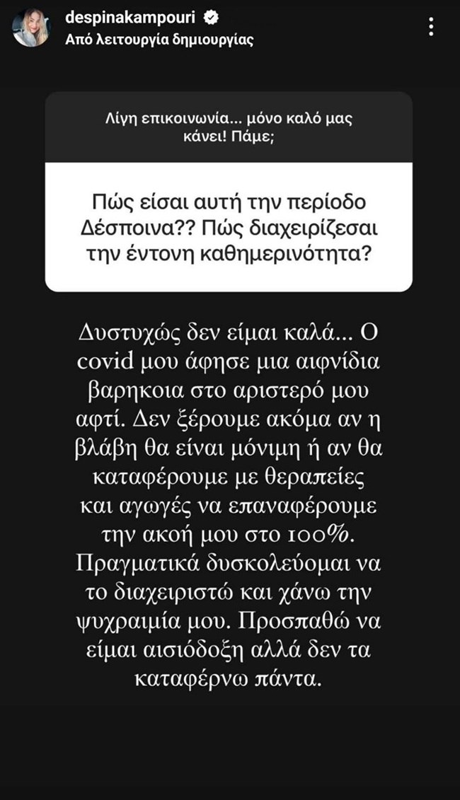 Η Δέσποινα Καμπούρη βίωσε την τρίτη της μάχη με τον κορονοϊό πριν από λίγες ημέρες. Ήταν εκτός και από τον τομέα της ψυχαγωγίας, αφού δεν κατάφερε να βρεθεί στις επαγγελματικές της υποχρεώσεις στην εκπομπή “Πάμε Δανάη”. Καταπιάστηκε με τις ερωτήσεις που της έκαναν οι ακόλουθοί της στο Instagram, διηγούμενη τα προβλήματα που αντιμετωπίζει μετά τη νόσησή της από τον ιό.