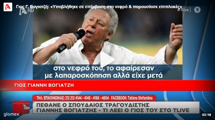 Όπως αποκάλυψε ο γιος του σπουδαίου καλλιτέχνη μιλώντας στο T-live και στην Πόπη Παπαδοπούλου ο πατέρας του υπεβλήθη λαπαροσκοπικά σε επέμβαση στα νεφρά, που δυστυχώς οδήγησε σε επιπλοκές.