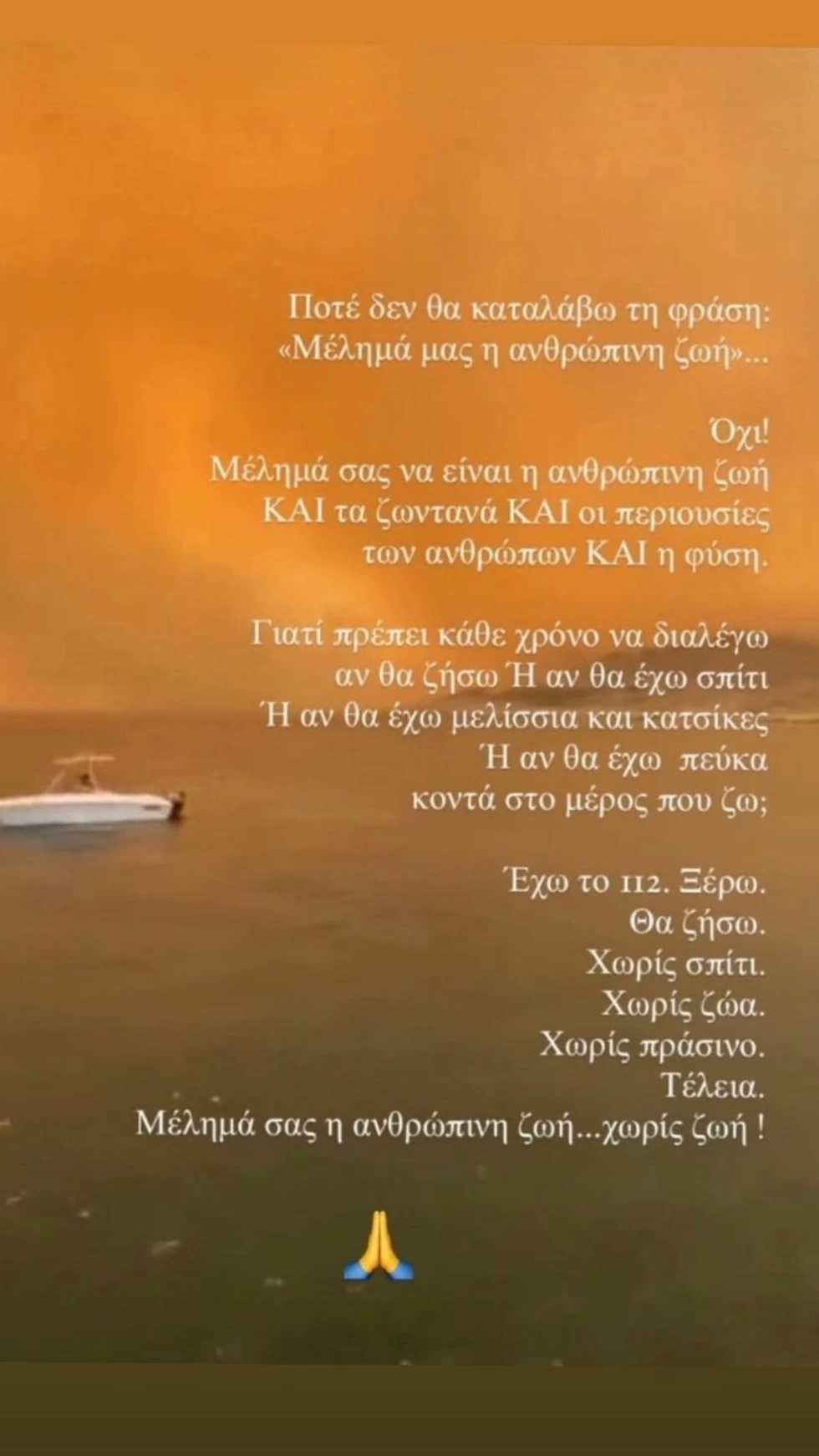 Έχω το 112. Ξέρω. Θα ζήσω. Χωρίς σπίτι, χωρίς ζώα, χωρίς πράσινο. Τέλεια! Μέλημά σας η ανθρώπινη ζωή, χωρίς ζωή», έγραψε στο στόρι που ανέβασε ο ίδιος στο Instagram account του.