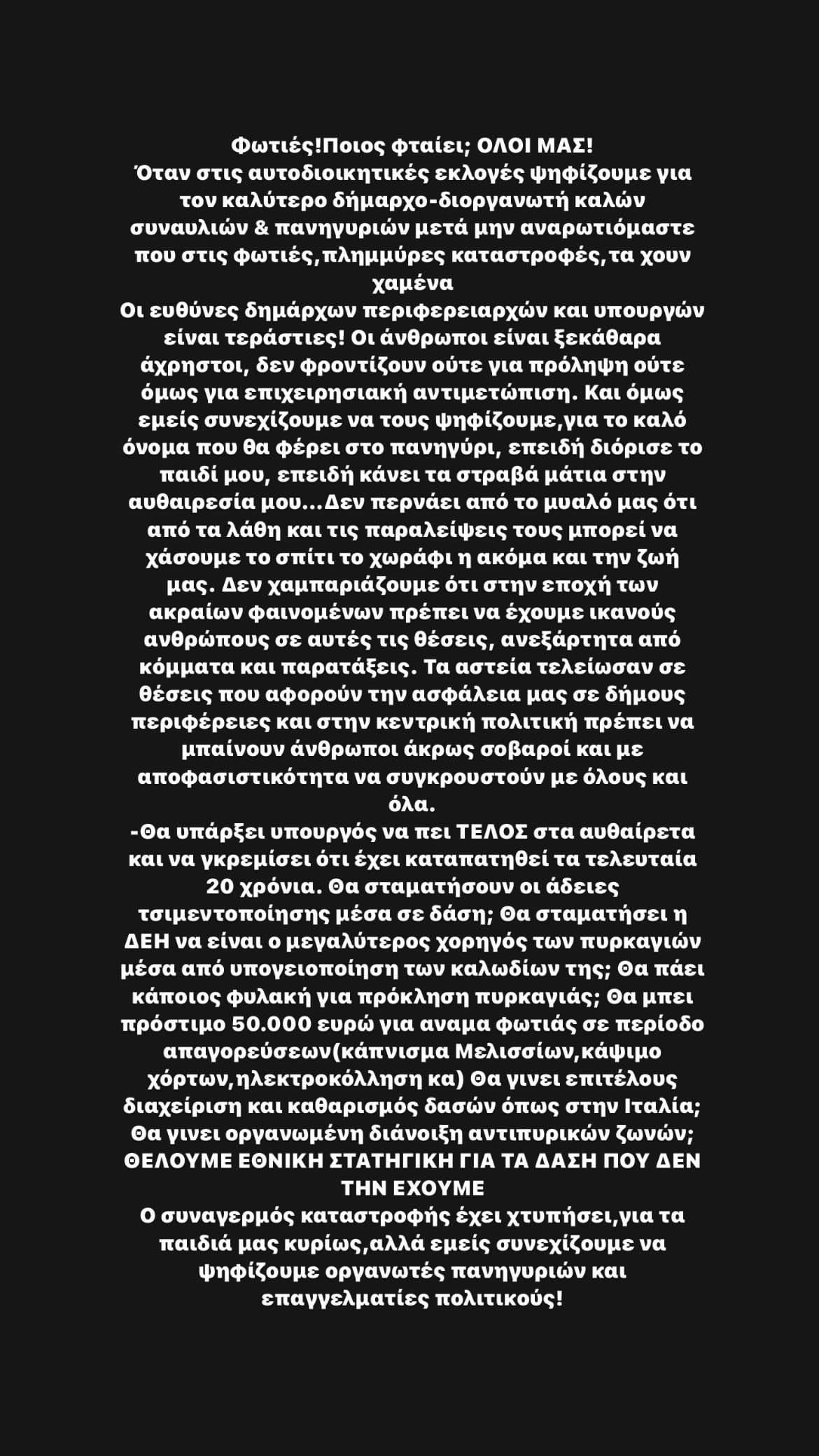 «Θα υπάρξει υπουργός να πει ΤΕΛΟΣ στα αυθαίρετα και να γκρεμίσει ότι έχει καταπατηθεί τα τελευταία 20 χρόνια. Θα σταματήσουν οι άδειες τσιμεντοποίησης μέσα σε δάση; Θα σταματήσει η ΔΕΗ να είναι ο μεγαλύτερος χορηγός των πυρκαγιών μέσα από υπογειοποίηση των καλωδίων της; Θα πάει κάποιος φυλακή για πρόκληση πυρκαγιάς;