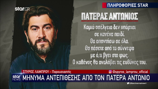 «Καμία ασέλγεια δεν υπάρχει σε κανένα παιδί. Θα απαντήσω σε όλα. Θα πέσετε από τα σύννεφα με ό,τι βγει στο φως. Ο καθένας θα αναλάβει τις ευθύνες του» λέει ο πατέρας Αντώνιος.