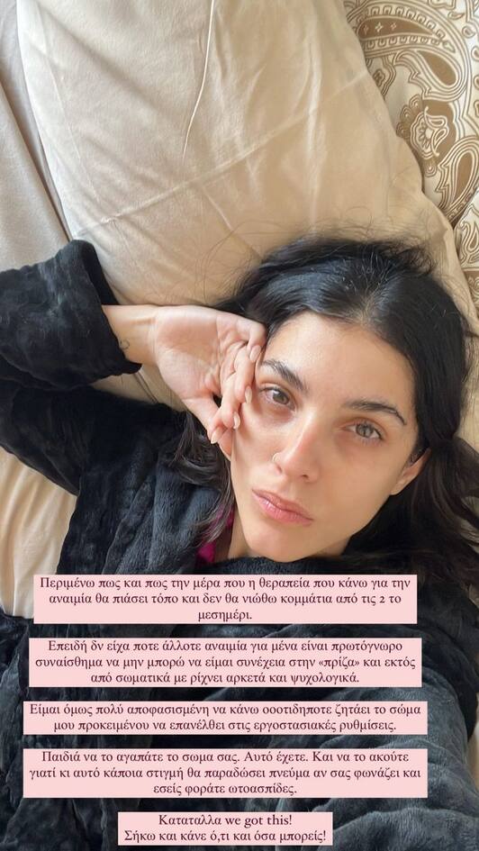 «Περιμένω πώς και πώς την ημέρα που η θεραπεία μου για την αναιμία μου θα πιάσει τόπο και δεν θα νιώθω κομμάτια από τις 2 το μεσημέρι. Επειδή δεν είχα ποτέ άλλοτε αναιμία, για μένα είναι πρωτόγνωρο συναίσθημα να μην μπορώ να είμαι συνέχεια στην “πρίζα” και εκτός από σωματικά με ρίχνει αρκετά και ψυχολογικά. Είμαι όμως πολύ αποφασισμένη να κάνω το οτιδήποτε ζητάει το σώμα μου προκειμένου να επανέλθει στις εργοστασιακές ρυθμίσεις. Παιδιά να αγαπάτε το σώμα σας. Αυτό έχετε! Και να το ακούτε γιατί και αυτό κάποια στιγμή θα παραδώσει πνεύμα αν σας φωνάζει και εσείς φοράτε ωτοασπίδες» αναφέρει με τόνο αισιοδοξίας και δόση χιούμορ στην ανάρτησή της.