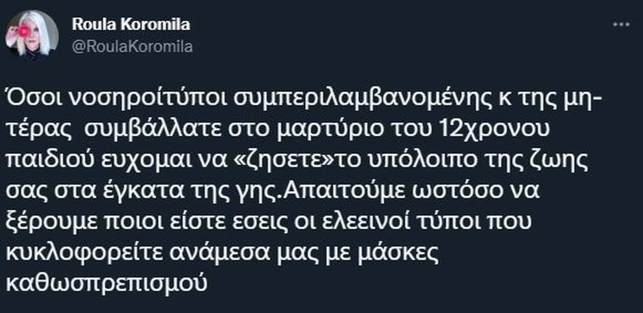 «Όσοι νοσηροί τύποι συμπεριλαμβανομένης και της μη-τέρας, συμβάλλατε στο μαρτύριο του 12χρονου παιδιού εύχομαι να “ζήσετε” το υπόλοιπο της ζωής σας στα έγκατα της γης. Απαιτούμε ωστόσο να ξέρουμε ποιοι είστε εσείς οι ελεεινοί τύποι που κυκλοφορείτε ανάμεσά μας με μάσκες καθωσπρεπισμού», έγραψε χαρακτηριστικά στη δημοφιλή πλατφόρμα κοινωνικής δικτύωσης η Ρούλα Κορομηλά.