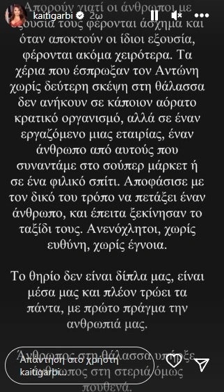 Αποφάσισε με τον δικό του τρόπο να πετάξει έναν άνθρωπο κι έπειτα ξεκίνησαν το ταξίδι τους. Ανενόχλητοι, χωρίς ευθύνη, χωρίς έγνοια. Το θηρίο δεν είναι δίπλα μας, είναι μέσα μας και πλέον τρώει τα πάντα με πρώτο πράγμα την ανθρωπιά μας. Άνθρωπος στη θάλασσα υπήρξε στη στεριά όμως πουθενά», έγραψε η ίδια στον προσωπικό της λογαριασμό ξεσπώντας!