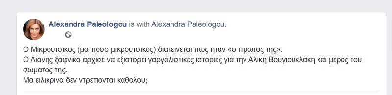 H Aλεξάνδρα Παλαιολόγου προχώρησε Σε μια ανάρτησή της στο facebook χαρακτηρίζοντας “μικρούτσικο” τον Ανδρέα Μικρούτσικο και αναρωτιέται πως γίνεται να μην ντρέπεται τόσο εκείνος όσο και ο Γιώργος Λιάνης για αυτά που είπε για την Αλίκη Βουγιουκλάκη.