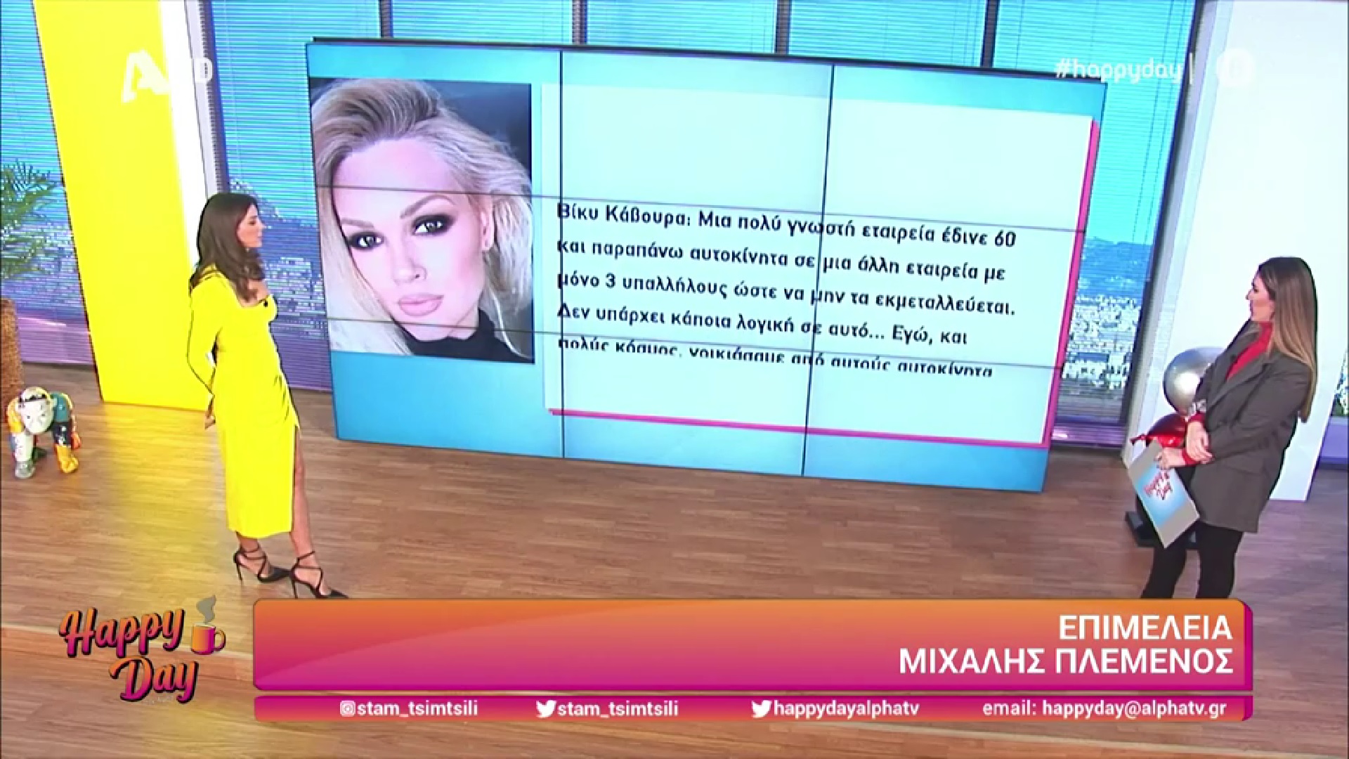 Η Σταματίνα Τσιμτσιλή μιλώντας στην εκπομπή της «Happy Day» είπε πως «συνάντησα προχθές τη Βίκυ Κάβουρα και την είδα πάρα πολύ αναστατωμένη και άρχισε να μου περιγράφει το πώς ξαφνικά, από τη μια στιγμή στην άλλη βρέθηκε χωρίς αυτοκίνητο και μάλιστα, με έναν κινηματογραφικό τρόπο, γιατί, ενώ ήταν εν κινήσει και έφτανε στο σπίτι της, βρέθηκε αντιμέτωπη με τους αστυνομικούς που της είπαν, πρέπει να μας παραδώσετε το αυτοκίνητό σας, και εκείνη έμεινε με το στόμα ανοιχτό.