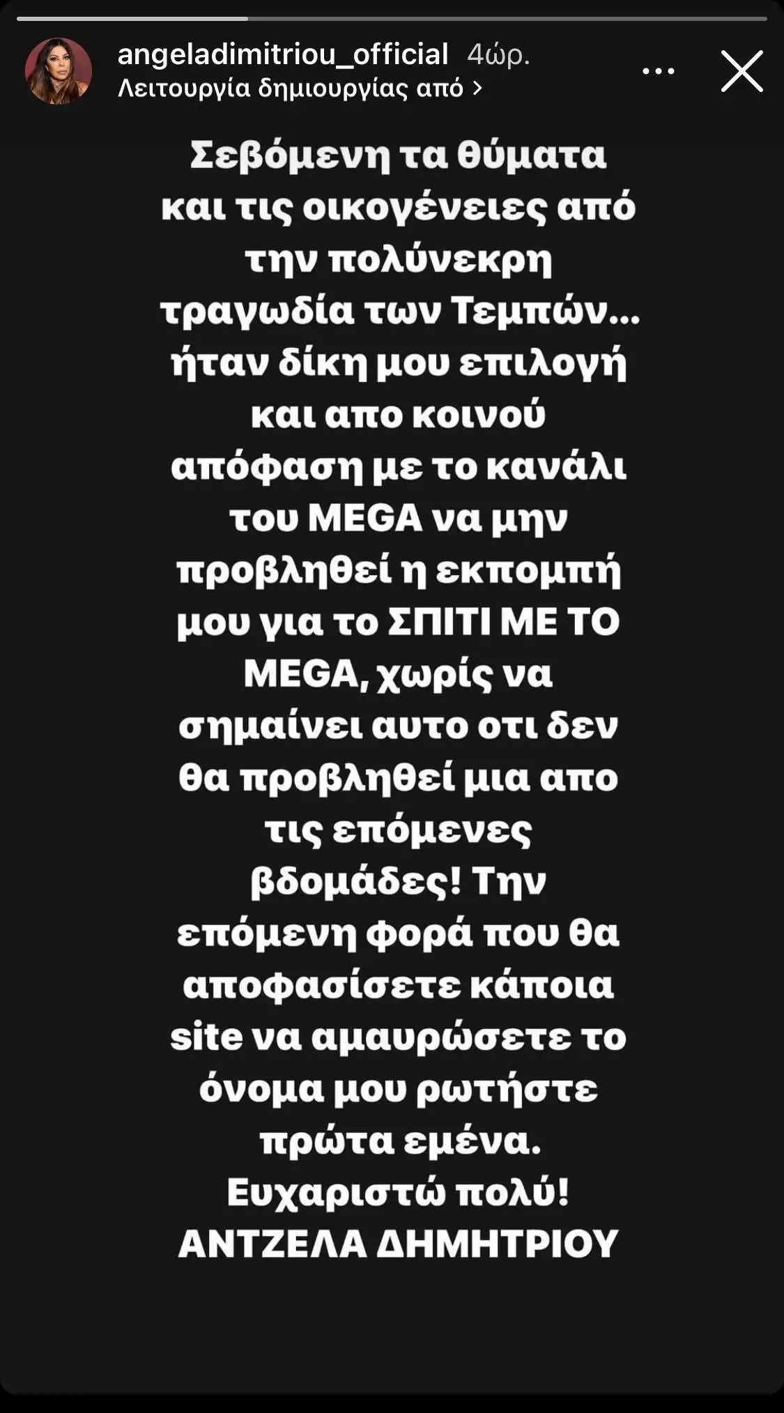Με ένα στόρι στον προσωπικό της λογαριασμό στο Instagram ενημέρωσε η Άντζελα Δημητρίου τον λόγο που δεν θα προβληθεί το επεισόδιο – αφιέρωμα από την εκπομπή «σπίτι με το Mega».