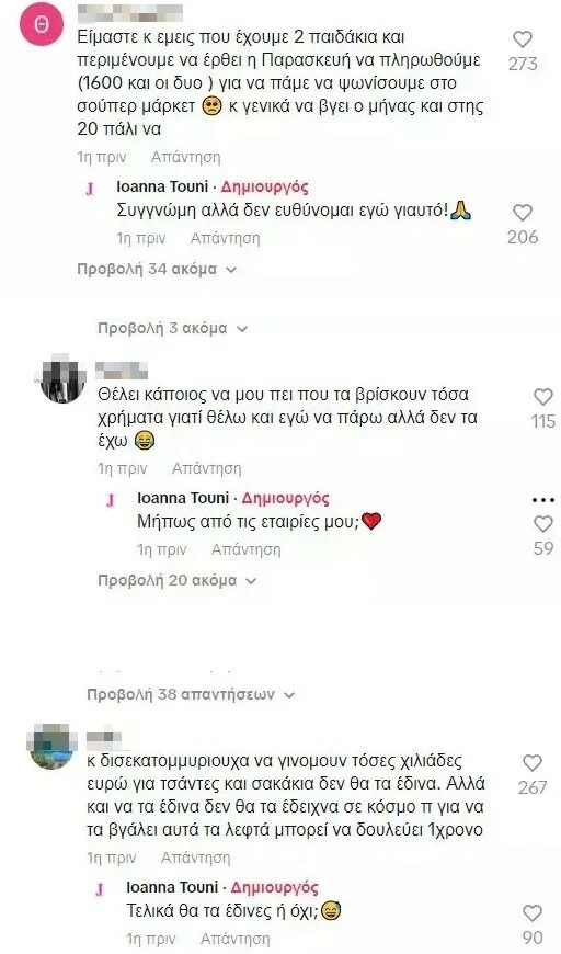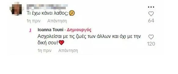 «Αλήθεια τώρα, σας πειράζει η Ιωάννα Τούνη; Η κοπέλα κατάφερε από το μείον να ανέβει πάνω. Η κοπέλα έχει κάνει τόσα πολλά για πάρα πολλούς. Άσχετα αν αυτό δεν αναγνωρίζεται».