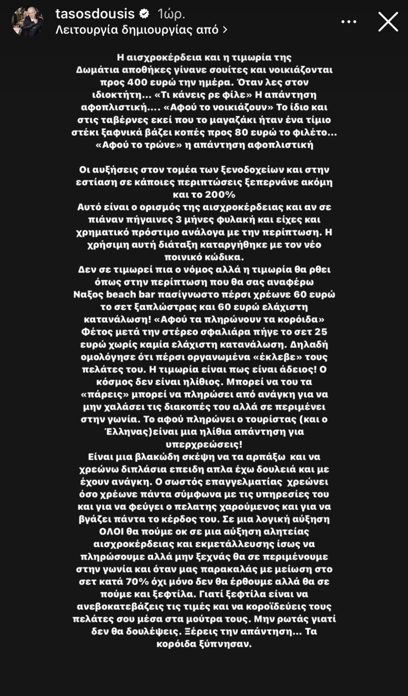 Όπως είναι φανερό, αλλά έχει γίνει ήδη γνωστό και από επίσημα χείλη, ο τουρισμός καταρρέει σε δημοφιλείς προορισμούς και ο Τάσος Δούσης, με νέο ξέσπαμα στην σελίδα του στο Instagram, αποκαλύπτει τις πραγματικές αιτίες. Ο ίδιος, μιλά τις αυξήσεις σε ξενοδοχεία και εστίαση που σε κάποιες περιπτώσεις ξεπέρασε και το 200% αλλά και για αποθήκες που… νοικιάζονται για 400 ευρώ.