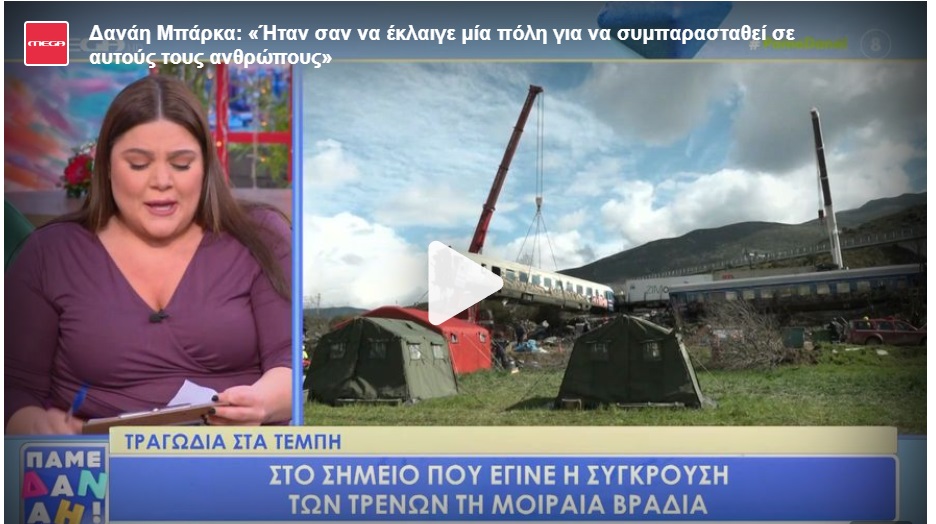 Η Δανάη Μπάρκα, η οποία βρέθηκε στα Τέμπη μετά το τραγικό δυστύχημα, είπε επίσης: «Πηγαίναμε νιώθωντας ότι θα είμαστε ψύχραιμοι. Δεν πιέσαμε άνθρωπο, δεν εκμεταλλευτήκαμε άνθρωπο. Η ατμόσφαιρα και η ενέργεια που επικρατεί πάνω από το σημείο, δυστυχώς είναι τρομακτική. Ήταν σαν να κλαίει μια ολόκληρη πόλη για να συμπαρασταθεί σε αυτούς τους ανθρώπους. Όταν φτάσαμε στην πόλη, γύρω μας υπήρχαν μόνο νεκροφόρες, μας κόπηκαν τα πόδια» είπε σε άλλο σημείο.