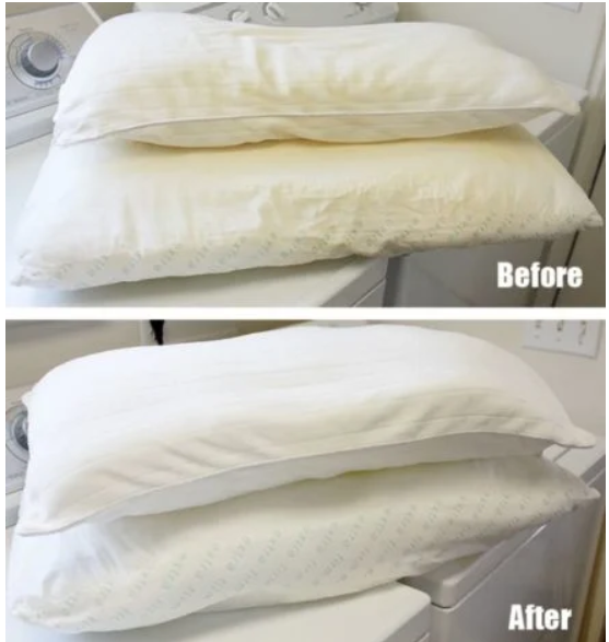 Είναι τόσο ενοχλητικό όταν τα κάτασπρα μαξιλάρια σας αποκτούν μια κίτρινη απόχρωση. Τα καλά νέα είναι ότι μπορείτε να το διορθώσετε αυτό. Αναμείξτε τα ακόλουθα συστατικά: 1 φλιτζάνι απορρυπαντικό πλυντηρίου, 1 φλιτζάνι σκόνη απορρυπαντικού πλυντηρίου πιάτων, 1 φλιτζάνι χλωρίνη, ½ φλιτζάνι βόρακα και πολύ ζεστό νερό. Τρίψτε τα μαξιλάρια σας με το μείγμα, ξεπλύνετε καλά και αφήστε να στεγνώσουν.
