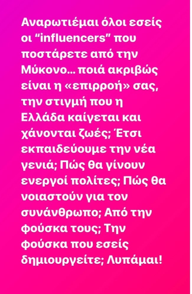 “Αναρωτιέμαι όλοι εσείς οι influencers που ποντάρετε από τη Μύκονο. Ποια είναι ακριβώς η “επιρροή” σας τη στιγμή που η Ελλάδα καίγεται και χάνονται ζωές; ‘Έτσι εκπαιδεύουμε τη νέα γενιά; Πώς θα γίνουν ενεργοί πολίτες; Πώς θα νοιαστούν για τον συνάνθρωπο; Από τη φούσκα τους; Τη φούσκα που εσείς δημιουργείτε; Λυπάμαι”.