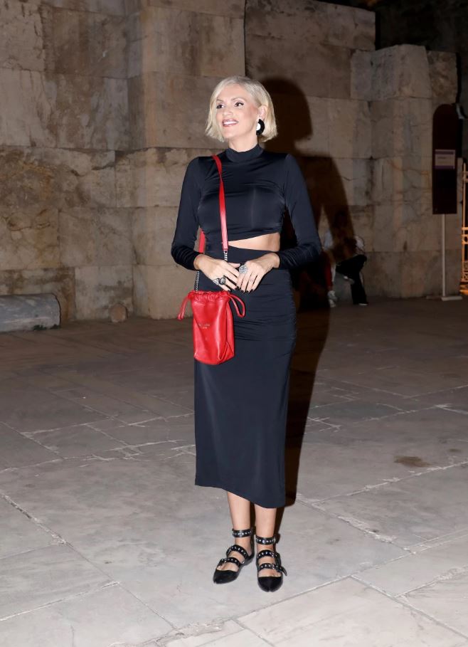 H Σάσα Σταμάτη το συνδύασε με ροκ μπαλαρίνες με αγκράφες και κόκκινη τσάντα σε στυλ πουγκί.