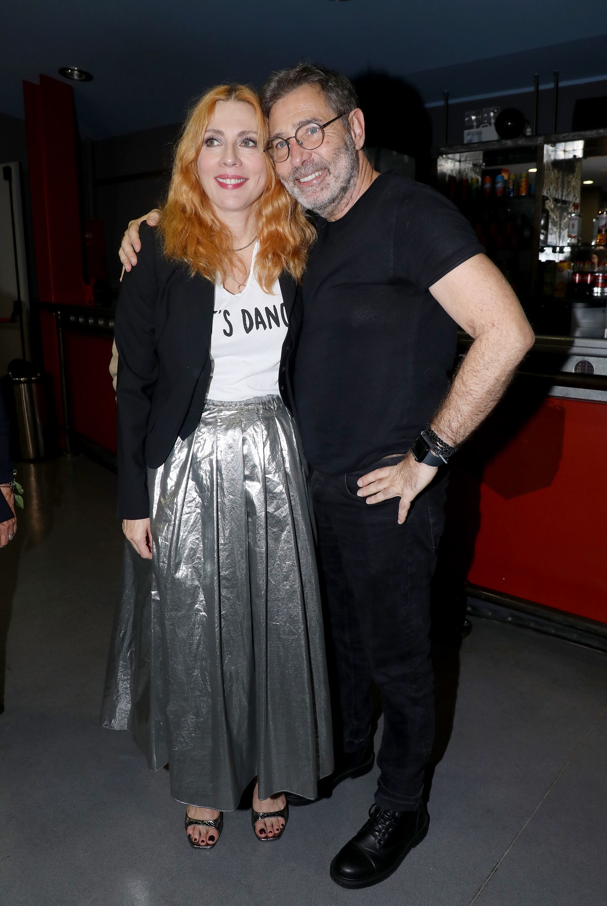 Στο φουαγιέ του θεάτρου η ηθοποιός φόρεσε ένα ιδιαίτερο σύνολο, με τα βλέμματα να τραβάει μία μεταλλιζέ, μακριά φούστα, την οποία συνδύασε με ψηλά πέδιλα σε παρόμοια απόχρωση, ένα λευκό T-shirt και μαύρο, μεσάτο σακάκι, ενώ τόνισε τα χείλη της με κόκκινο κραγιόν και άφησε τα κόκκινα μαλλιά της να πέφτουν στους ώμους.