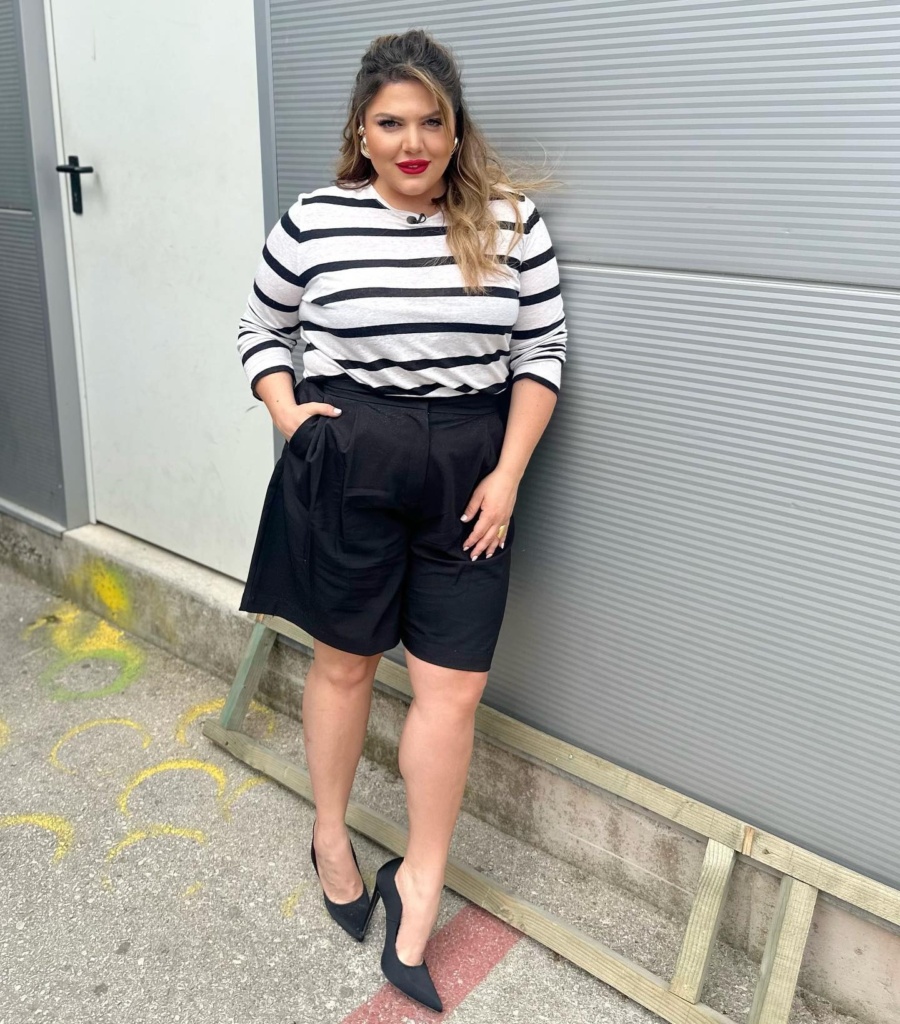 Κι αυτό το σύνολο που φόρεσε πρόσφατα είναι η ιδανική πρόταση για την εποχή αυτή. Ούτε κρύο, αλλά ούτε και ζέστη. Κοινώς φουλ ανοιξιάτικο και σικάτο. Επέλεξε λοιπόν να φορέσει ένα μίντι μαύρο σορτς σε huge γραμμή και ψηλομέσο.