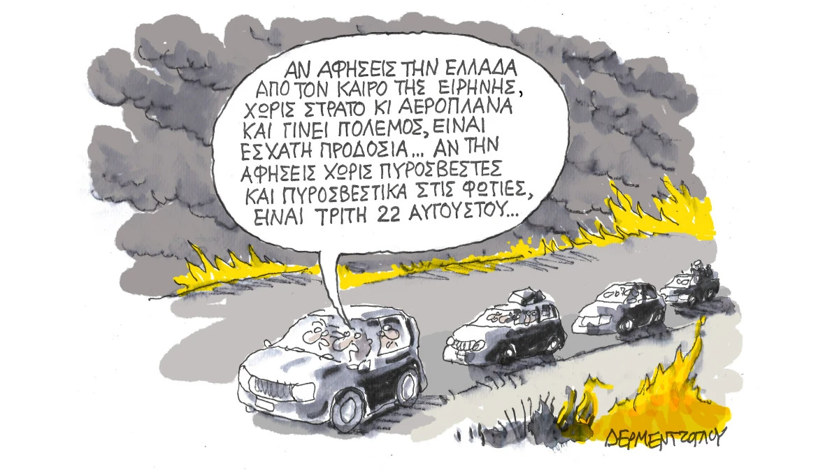 Στο σκίτσο του ο Γιάννης Δερμεντζόγλου δείχνει οικογένειες μέσα στα αυτοκίνητά τους να εκκενώνουν τις περιοχές που ζουν, περνώντας μέσα από τις φωτιές και τους καπνούς ενώ πουθενά δεν φαίνονται πυροσβεστικά μέσα να επιχειρούν κατά των πυρκαγιών.