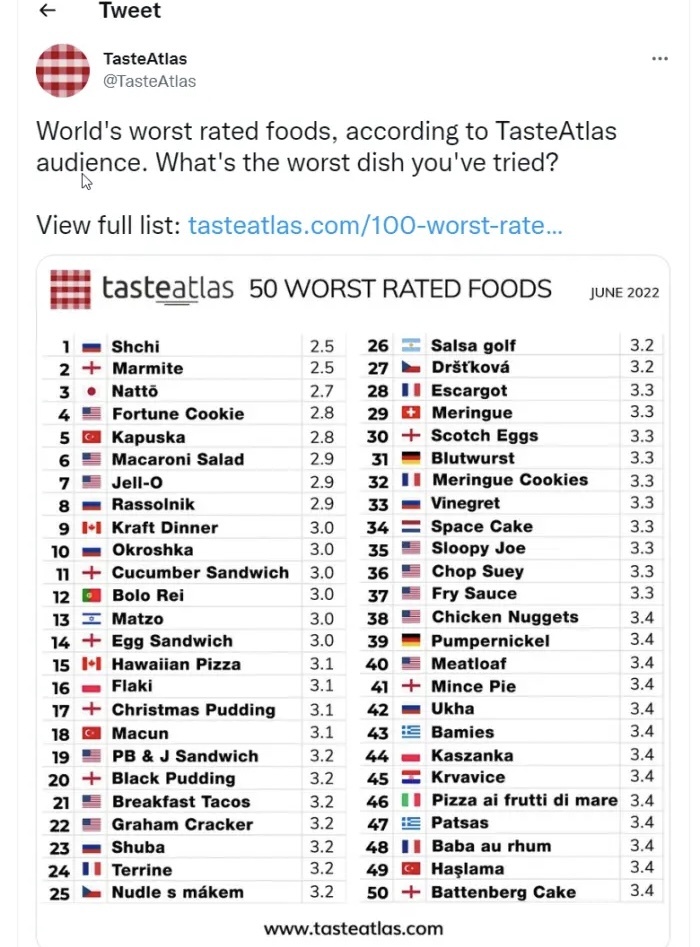 Το TasteAtlas λοιπόν, έφτιαξε μία λίστα και την έθεσε σε ψηφοφορία προς τους αναγνώστες του, με τα 100 χειρότερα φαγητά από όλο τον κόσμο.