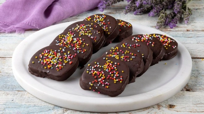 Παίρνουμε κάθε κομμάτι με ένα πιρούνι ή μια τσιμπίδα και το βουτάμε στη λιωμένη κουβερτούρα.