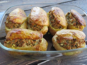 Ανακατεύετε καλά το μείγμα και γεμίζετε τις πατάτες με αυτό,Σκεπάστε με τα καπάκια τους ναι ψήστε σε βουτυρωμένο ταψί στους 220 βαθμούς μέχρι να γίνουν οι πατάτες και να ροδίσουν καλά.