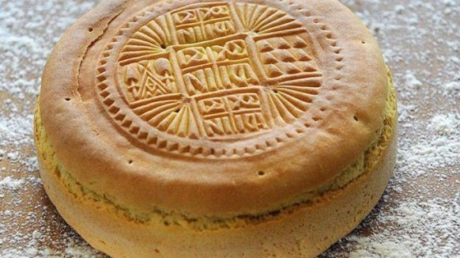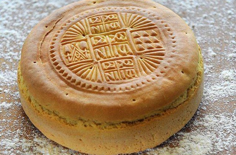 Με ένα ψιλό βελόνι τρυπάμε τα πρόσφορα στις 4 γωνίες της σφραγίδας και στην μέση (το βελόνι δεν πρέπει να φτάσει μέχρι κάτω). Ψήνουμε σε δυνατό φούρνο για 45 λεπτά περίπου.