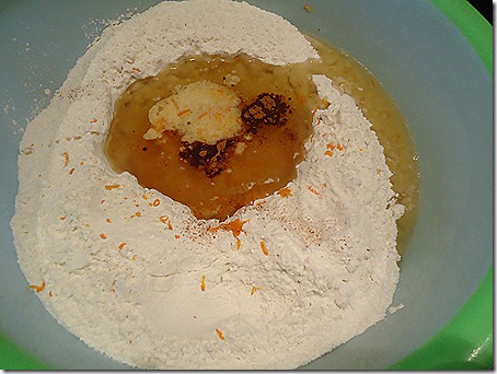 Προσθέτουμε το μείγμα με τα υγρά συστατικά στο μείγμα με τα στερεά και ανακατεύουμε πολύ απαλά με τα χέρια, για πολύ λίγο (το πολύ για 10 δευτερόλεπτα) για να μην κόψει το μείγμα.
