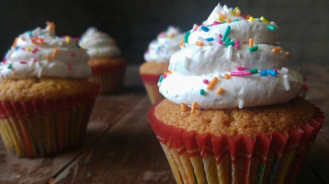 Σε ένα μεγάλο μπολ χτυπήστε το τυρί κρέμα, το βούτυρο και τη βανίλια μέχρι να αναμειχθούν. Χτυπήστε σταδιακά τη ζάχαρη άχνη μέχρι να γίνει λεία. Παγώστε τα cupcakes. Διακοσμήστε με πασπαλίσματα και χοντρή ζάχαρη όπως επιθυμείτε. Βάλτε τα υπόλοιπα στο ψυγείο.