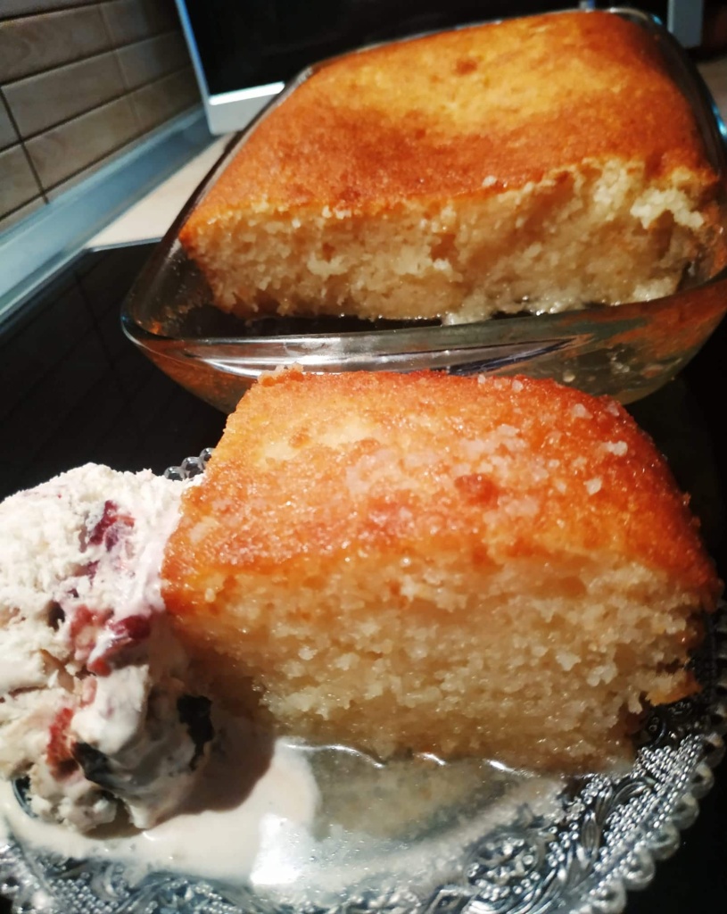 Μόλις ψηθεί το γλυκό, το κόβετε σε τετράγωνα ή μπακλαβαδωτά κομμάτια και το σιροπιάζετε αμέσως καυτό, ρίχνοντας το κρύο σιρόπι κουταλιά-κουταλιά για να πάει παντού.