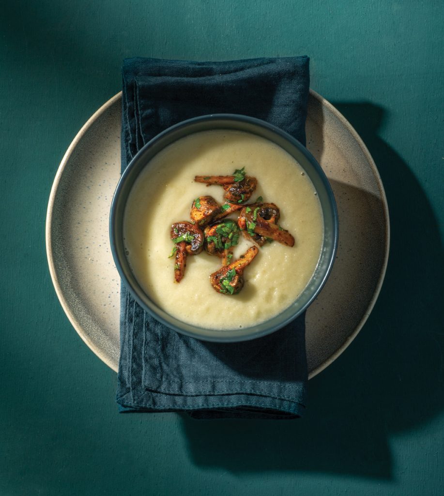 Μια ιδιαίτερη δυναμωτική βελουτέ σούπα με κουνουπίδι και πράσο. Σερβρίρεται με μανιτάρια τηγανιά που δίνουν το χειμωνιάτικο άρωμα.