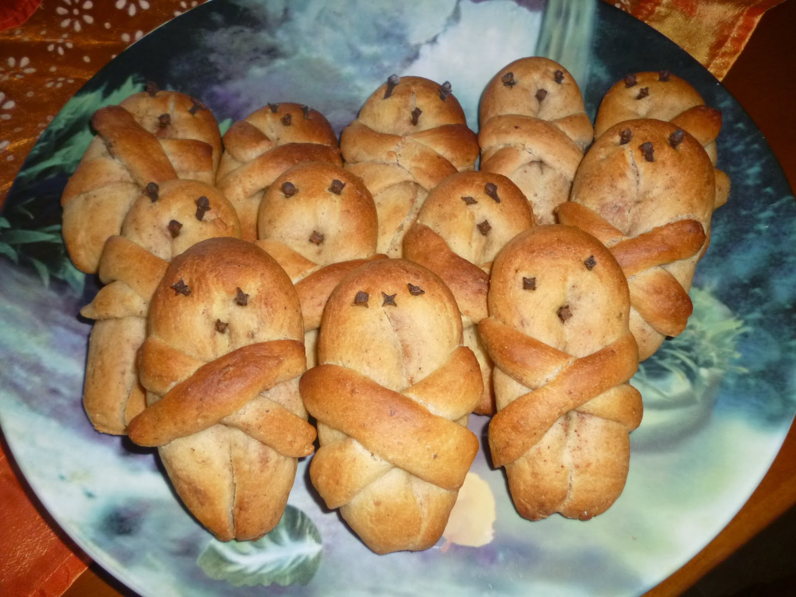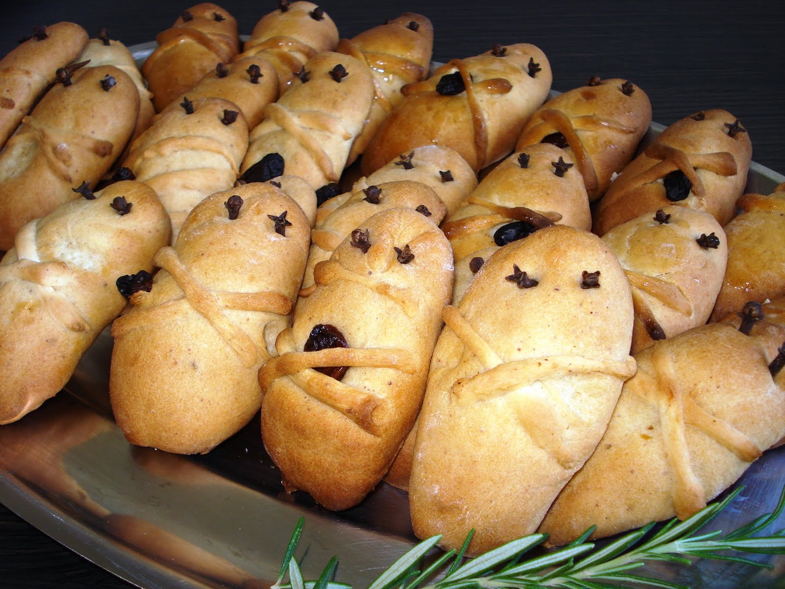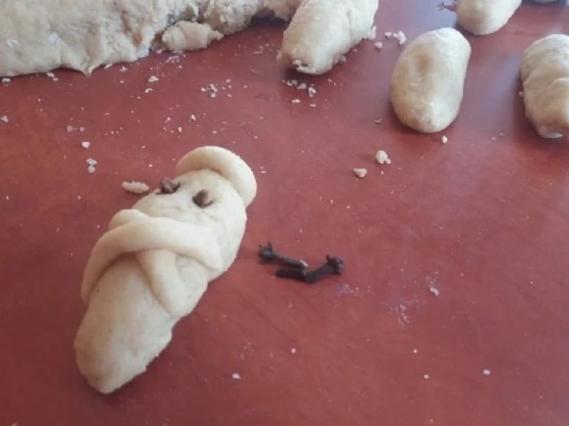 Ακόμη, πλάθουμε λεπτά κυκλάκια τα οποία τα βάζουμε πάνω στο κεφάλι για κάλυμμα. Τέλος, καρφώνουμε 2 γαρύφαλλο σε κάθε λαζαράκι για τα μάτια.