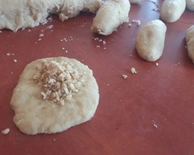 Πλάθουμε μικρά κυκλακια, τοποθετούμε στη μέση λίγα από τα καρύδια, τις σταφίδες και το σουσάμι.