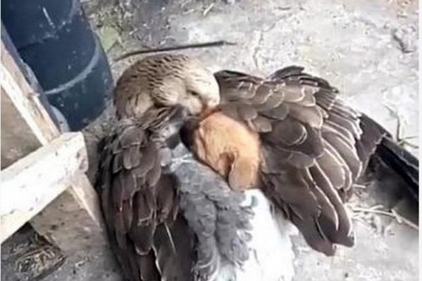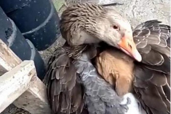 Η στιγμή που η χήνα βάζει το κουταβάκι κάτω από τα φτερά της