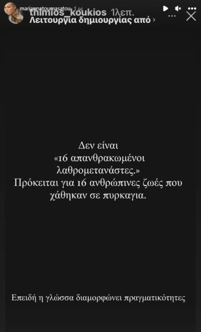 Στα media, όμως, οι άνθρωποι αυτοί αναφέρονταν ως νεκροί λαθρομετανάστες, κάτι που εξόργισε την Μαριάννα Τουμασάτου, η οποία αναδημοσίευσε στον προσωπικό της λογαριασμό στο Instagram το post του Θύμιου Κούκιου, τονίζοντας πως πρόκειται για ανθρώπινες ψυχές και τίποτε άλλο.
