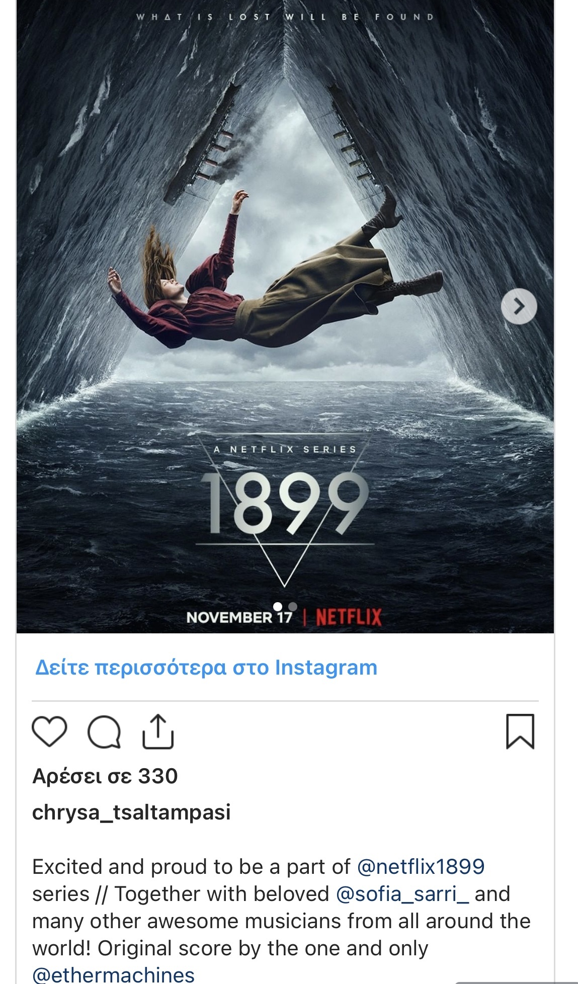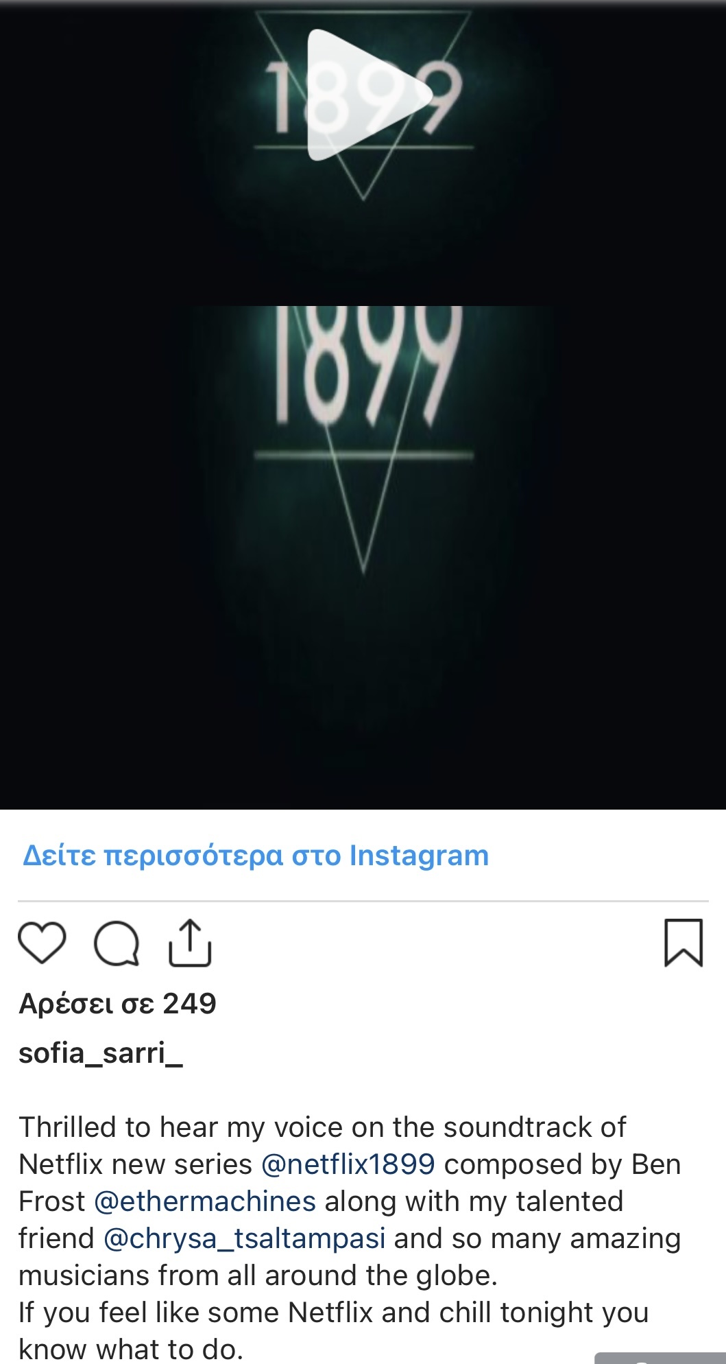 Με τη σειρά της η Χρύσα Τσαλταμπάση, που έχει δώσει κομμάτια της στις σειρές «Star Crossed», «Delirium», «Beauty and the beast» «Dos Lunas», «The secret circle», δημοσίευσε ένα screenshot από τα credits της μουσικής του 1899.