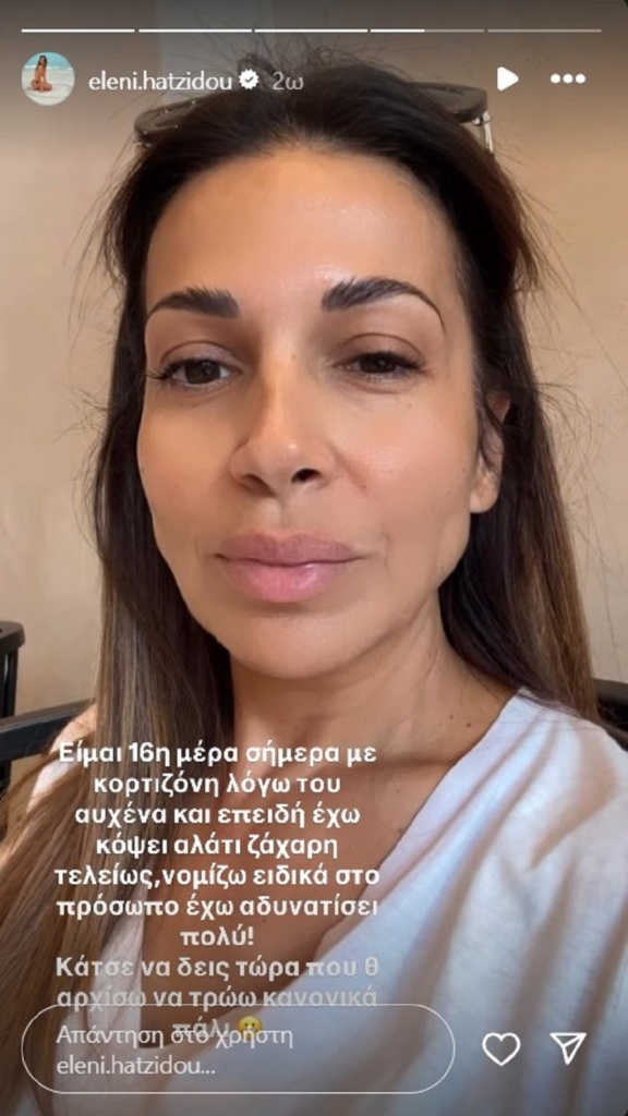«Είμαι 16η μέρα σήμερα με κορτιζόνη λόγω του αυχένα και επειδή έχω κόψει αλάτι, ζάχαρη τελείως, νομίζω ειδικά στο πρόσωπο έχω αδυνατίσει πολύ! Κάτσε να δεις τώρα που θα αρχίσω να τρώω κανονικά πάλι».