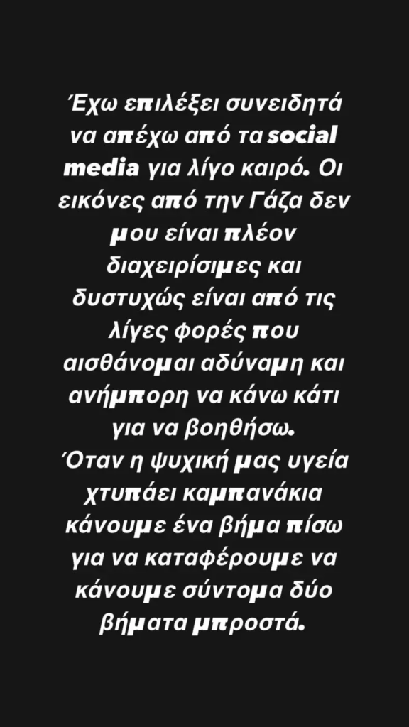 «Έχω επιλέξει συνειδητά να απέχω από τα social media για λίγο καιρό. Οι εικόνες από τη Γάζα δεν μου είναι πλέον διαχειρίσιμες και δυστυχώς είναι από τις λίγες φορές που αισθάνομαι αδύναμη και ανήμπορη να βοηθήσω. Όταν η ψυχική μας υγεία χτυπάει καμπανάκια κάνουμε ένα βήμα πίσω για να καταφέρουμε να κάνουμε σύντομα δύο βήματα μπροστά».