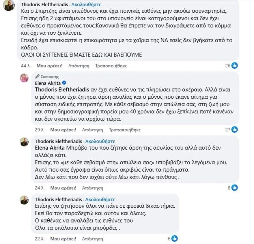 Ωστόσο, πιο δηκτικός ήταν ο Θοδωρής Ελευθεριάδης ο οποίος σχολίασε: Η κυρία Elena Akrita διέγραψε τελικά το ποστ στο οποίο ξέπλενε τον Σπίρτζη και επιτέθηκε λεκτικά σε μένα (όταν της επισήμανα ότι κάνει ξέπλυμα). Μα γιατί κυρία Ακριτα; Δεν έχετε το θάρρος της άποψης σας; Δεν είμαι απαράδεκτος ακόμη που ρίχνω ευθύνες στον Σπιρτζη για τον θάνατο της μάνας μου;».