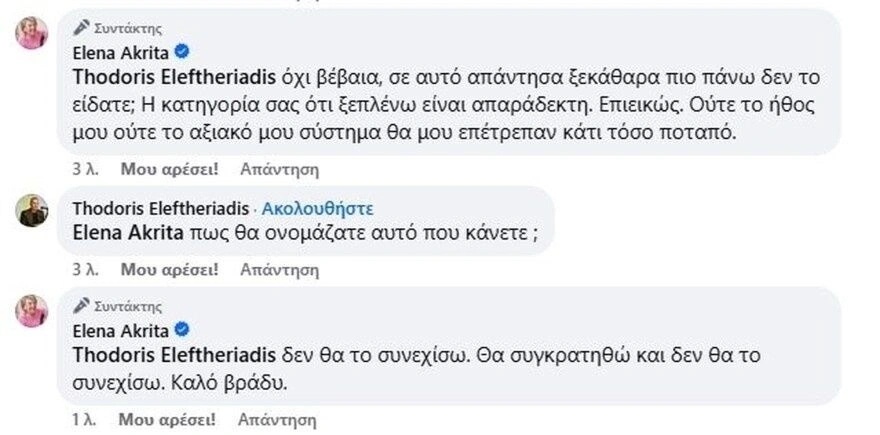 Η Ελένη Ακρίτα με την σειρά της έριξε λάδι στη φωτιά απαντώντας στο σχόλιο του κύριου Ελευθεριάδη ότι «αν έχει ευθύνες να τις πληρώσει στο ακέραιο. Αλλά είναι ο μόνος που έχει ζητήσει άρση ασυλίας και ο μόνος που έκανε αίτημα για σύσταση ειδικής επιτροπής. Με κάθε σεβασμό στην απώλειά σας, στη ζωή μου και στην δημοσιογραφική πορεία μου 40 χρόνια δεν έχω ξεπλύνει ποτέ κανέναν και δεν σκοπεύω να αρχίσω τώρα».