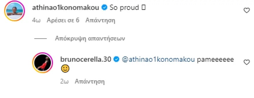 Συγκεκριμένα, η ηθοποιός εξέφρασε τον θαυμασμό της για τον σύντροφό της, γράφοντας: «Τόσο περήφανη». Ο Μπρούνο Τσερέλα απάντησε στο σχόλιό της, γράφοντας: «Πάμεεεεε».
