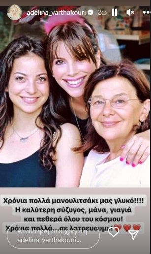 Ιδιαίτερη ημέρα σήμερα για όλο τον κόσμο καθώς γιορτάζουμε την γιορτή της μητέρας. Όσοι μπόρεσαν βρέθηκαν σήμερα με τις μητέρες τους για να γιορτάσουν την στιγμή ενώ πλήθος κόσμου προχώρησε σε τρυφερές και συγκινητικές αναρτήσεις στα social media. Κάπως έτσι έπραξε και η Αντελίνα Βαρθακούρη.