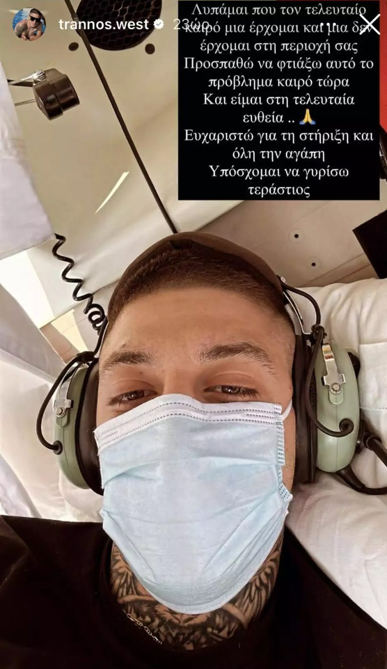 Μέσα από δύο instagram stories, ο τράπερ Trannos, μίλησε για ένα θέμα υγείας που τον ταλαιπωρεί. Ο ίδιος εμφανίστηκε σε δύο φωτογραφίες που τον έδειχναν εξαντλημένο στο νοσοκομείο και εξήγησε ότι αυτός ήταν ο λόγος των συνεχόμενων ακυρώσεων που είχε τον τελευταίο καιρό στις εμφανίσεις του.