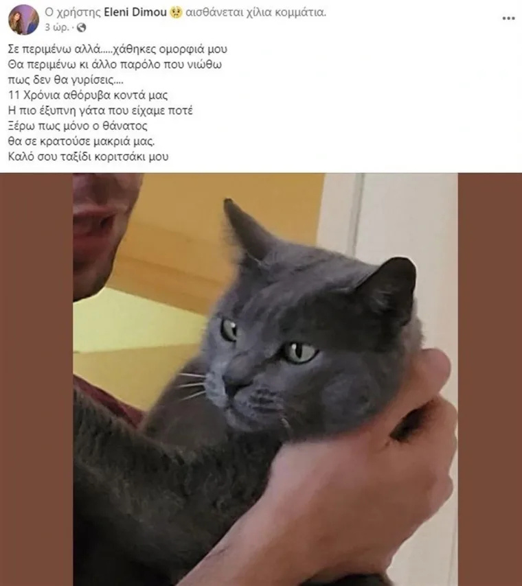 Θα περιμένω κι άλλο παρόλο που νιώθω πως δεν θα γυρίσεις…. 11 Χρόνια αθόρυβα κοντά μας. Η πιο έξυπνη γάτα που είχαμε ποτέ. Ξέρω πως μόνο ο θάνατος θα σε κρατούσε μακριά μας. Καλό σου ταξίδι κοριτσάκι μου…».
