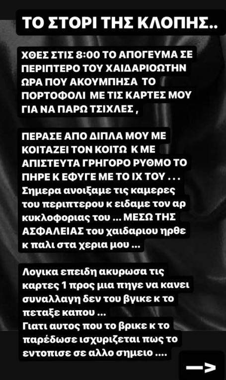 «Το story της κλοπής. Χθες, στις 8 το απόγευμα, σε περίπτερο του Χαϊδαρίου, την ώρα που ακούμπησα το πορτοφόλι με τις κάρτες μου για να πάρω τσίχλες, πέρασε από δίπλα μου, με κοιτάζει, τον κοιτώ και με απίστευτα γρήγορο ρυθμό το παίρνει και φεύγει με το Ι.Χ του.