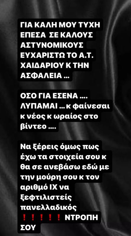 Όσο για σένα, λυπάμαι και φαίνεσαι και νέος και ωραίος στο βίντεο. Να ξέρεις όμως πως έχω τα στοιχεία σου και θα σε ανεβάσω εδώ με τη μούρη σου και τον αριθμό Ι.Χ σου να ξεφτιλιστείς πανελλαδικώς. Ντροπή σου» έγραψε η Ευρυδίκη Παπαδοπούλου.