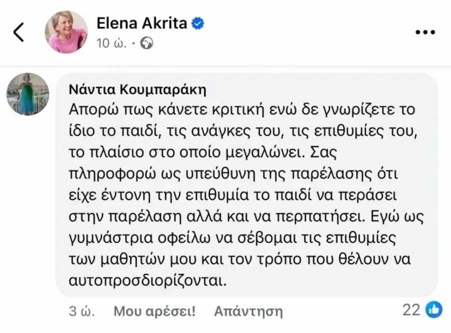 Την ανάρτηση της Ακρίτα σχολίασε και καθηγήτρια και υπεύθυνη της παρέλασης στη Λαμία. «Απορώ πώς κάνετε κριτική ενώ δεν γνωρίζετε το ίδιο το παιδί, τις ανάγκες του, τις επιθυμίες του, το πλαίσιο στο οποίο μεγαλώνει. Σας πληροφορώ ως υπεύθυνη της παρέλασης ότι είχε έντονη επιθυμία το παιδί να περάσει στην παρέλαση αλλά και να περπατήσει. Ως γυμνάστρια, εγώ οφείλω να σέβομαι τις επιθυμίες των μαθητών μου και τον τρόπο που θέλουν να αυτοπροσδιορίζονται» έγραψε η εκπαιδευτικός.