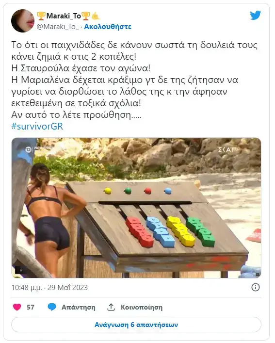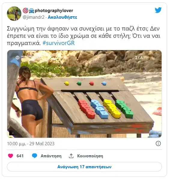 Οι παιχνιδάδες του Survivor All Star δεν παρατήρησαν το λάθος στα χρώματα του παζλ της Μαριαλένας, αλλά δεν συνέβη το ίδιο και με τους χρήστες του Twitter, οι οποίοι άφησαν αιχμές ότι η παραγωγής ευνοεί επίτηδες κάποιους παίκτες.