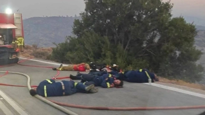 Το Fire Fighting Greece δημοσίευσε μια φωτογραφία από τους αποκαμωμένους πυροσβέστες και απεικονίζει πλήρως την υπεράνθρωπη προσπάθεια που καταβάλλεται.