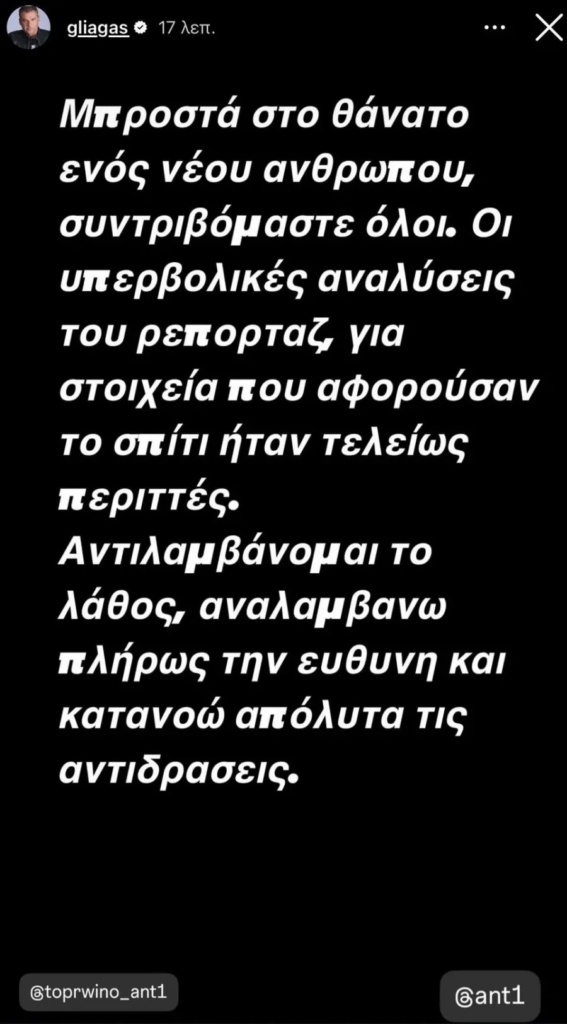 Ο παρουσιαστής είχε απαντήσει και με story μέσα από τον λογαριασμό του, την Πέμπτη στο Instagram, γράφοντας: «Μπροστά στο θάνατο ενός νέου ανθρώπου, συντριβόμαστε όλοι. Οι υπερβολικές αναλύσεις του ρεπορτάζ, για στοιχεία που αφορούσαν στο σπίτι ήταν τελείως περιττές. Αντιλαμβάνομαι το λάθος, αναλαμβάνω πλήρως την ευθύνη και κατανοώ απόλυτα τις αντιδράσεις» έγραψε ο παρουσιαστής.